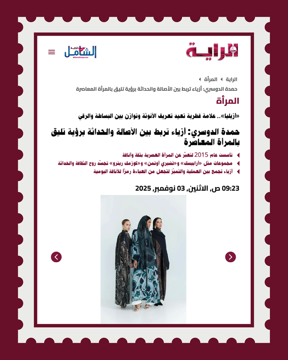 Azalea Designs has also gained recognition in regional media, including a feature in November 2025 by Raya Newspaper titled “Hamda Al Dosari: Designs that Unite Heritage and Modernity with a Vision for the Contemporary Woman”, which highlighted the brand’s growth since 2015 and its unique approach to merging traditional elements with modern elegance. This feature reflects the brand’s rising presence across fashion publications and its influence within the regional style landscape.